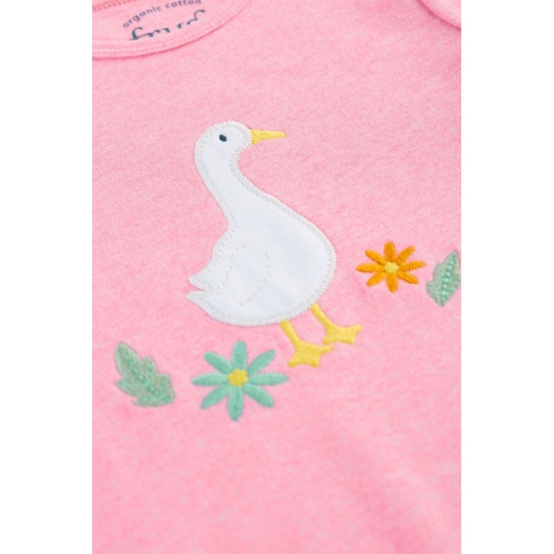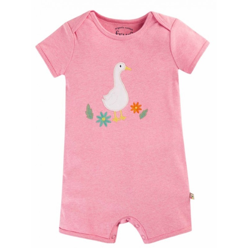 Dieser süße Baby Spieler von frugi hat eine große Enten-Applikation. Mit amerikanischem Ausschnitt und Druckknöpfe in dem Beinbereich.