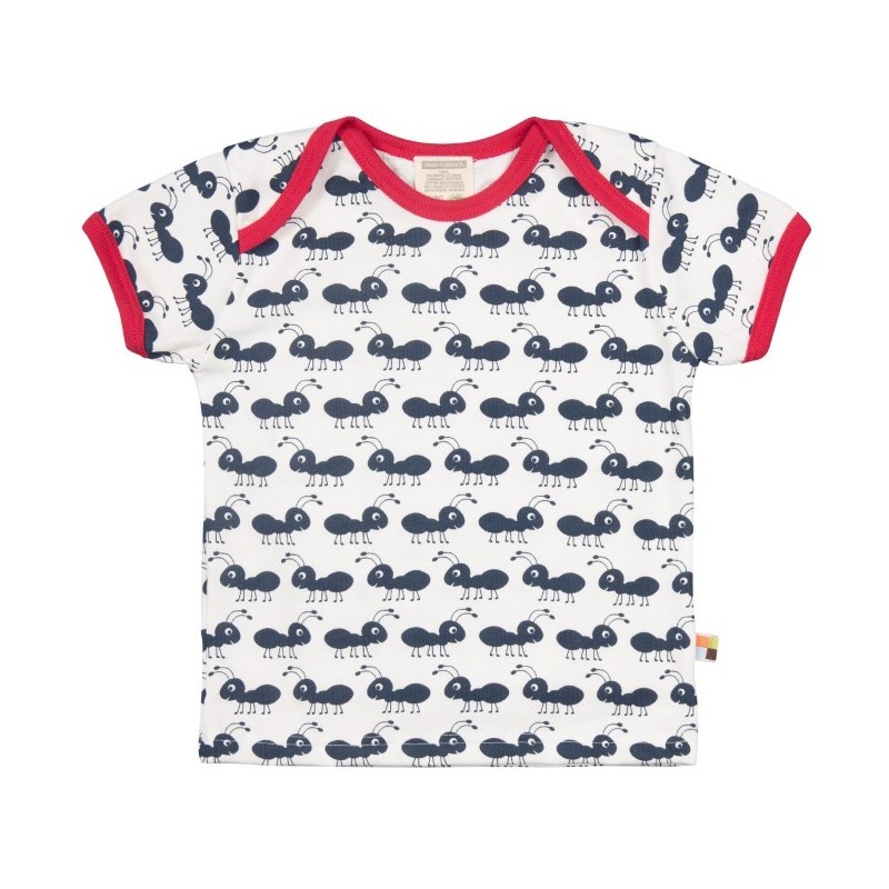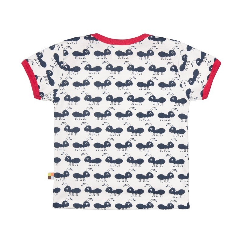 Das Shirt ist mit einem lustigen Ameisen-Allover verziert und die Kanten sind mit einem kontrastfarbigen Einfassband abgesetzt.
