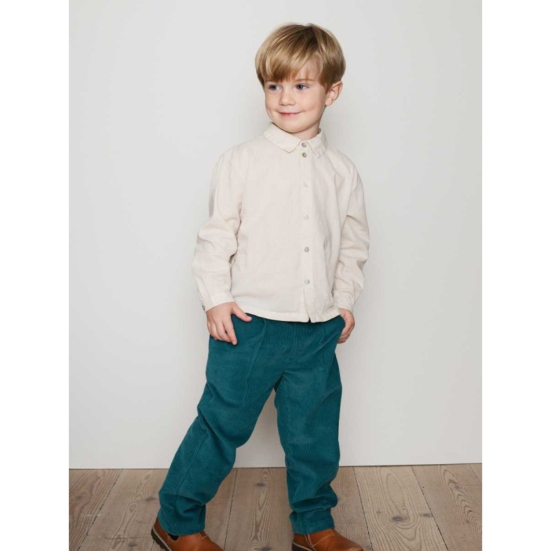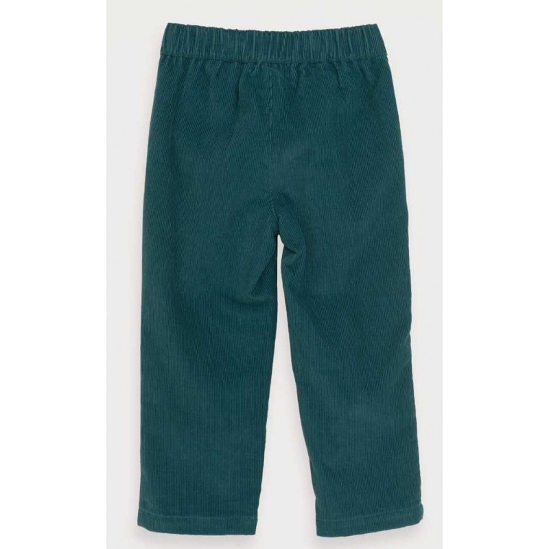 Weiche Kinder Hose aus feinem Babycord mit zwei Bundfalten, 2 seitlichen Eingriffstaschen und Druckknopf am elastischen Bündchen.