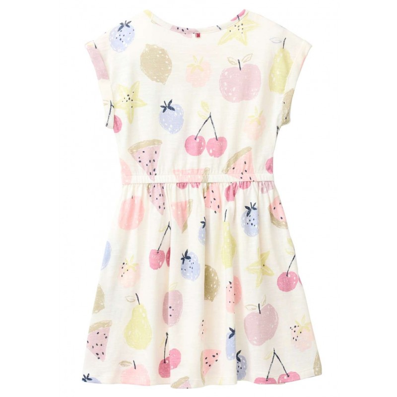 Süßes knielanges Kinderkleid aus leichtem Slub Jersey-Stoff mit angesetztem Tellerrock und Früchte-Allover. Mit gekrempelten Ärmeln.