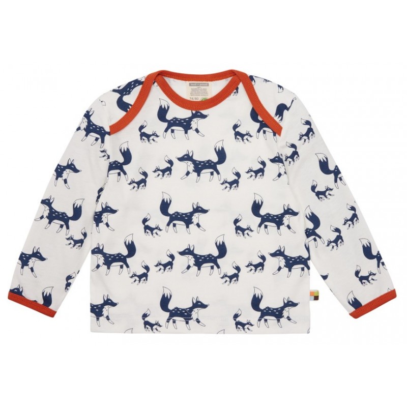 Das Shirt ist mit einem süßen Fuchs-Allover verziert und die Kanten sind mit einem kontrastfarbigen Einfassband abgesetzt.