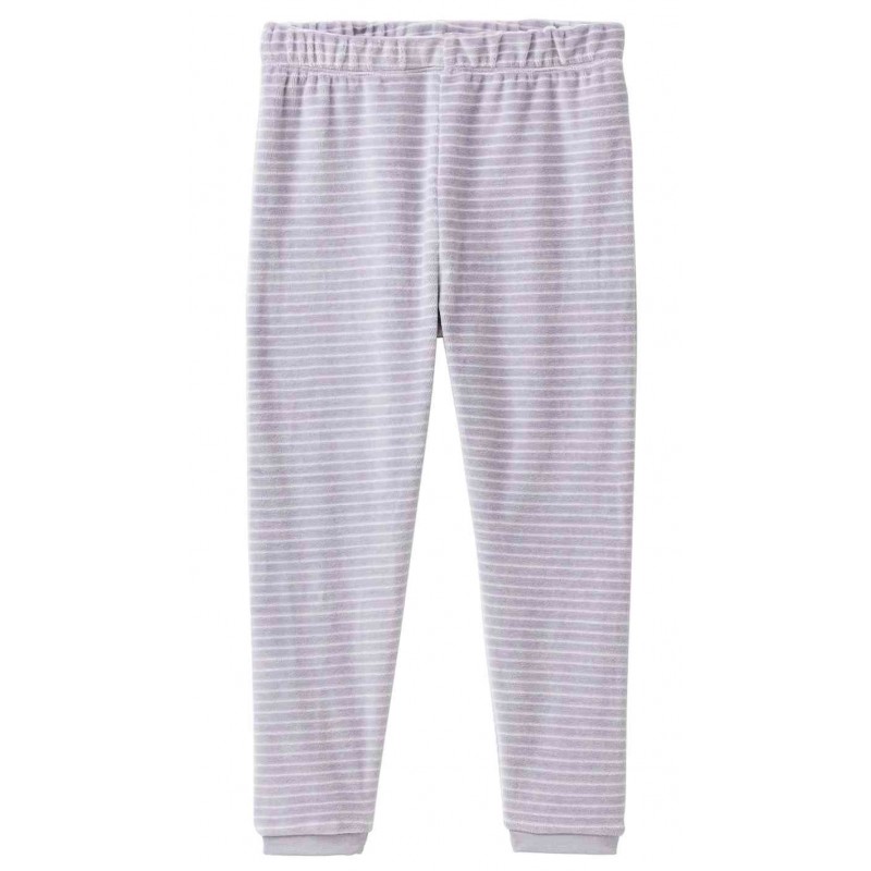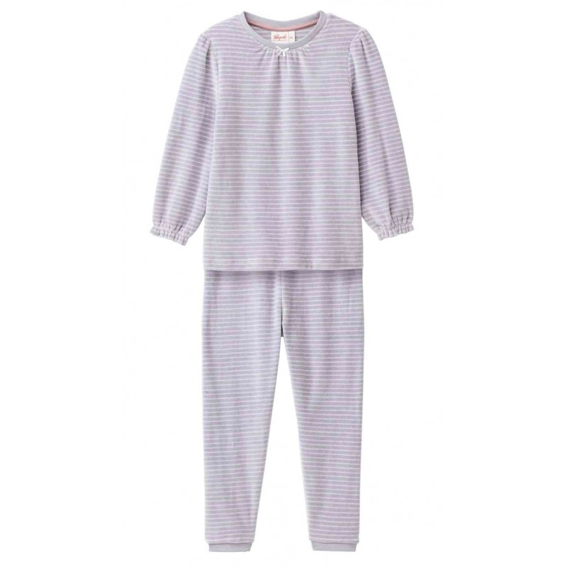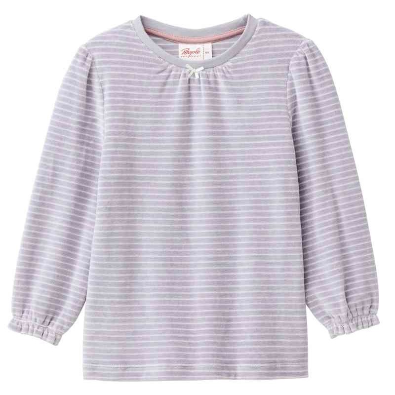Süßer langärmeliger Kinder Schlafanzug mit Streifen aus Nickistoff von People Wear Organic. Mit angekräuselten Ärmeln, Zierschleife am Ausschnitt und gerüschtem Ärmelsaum.