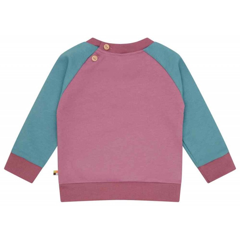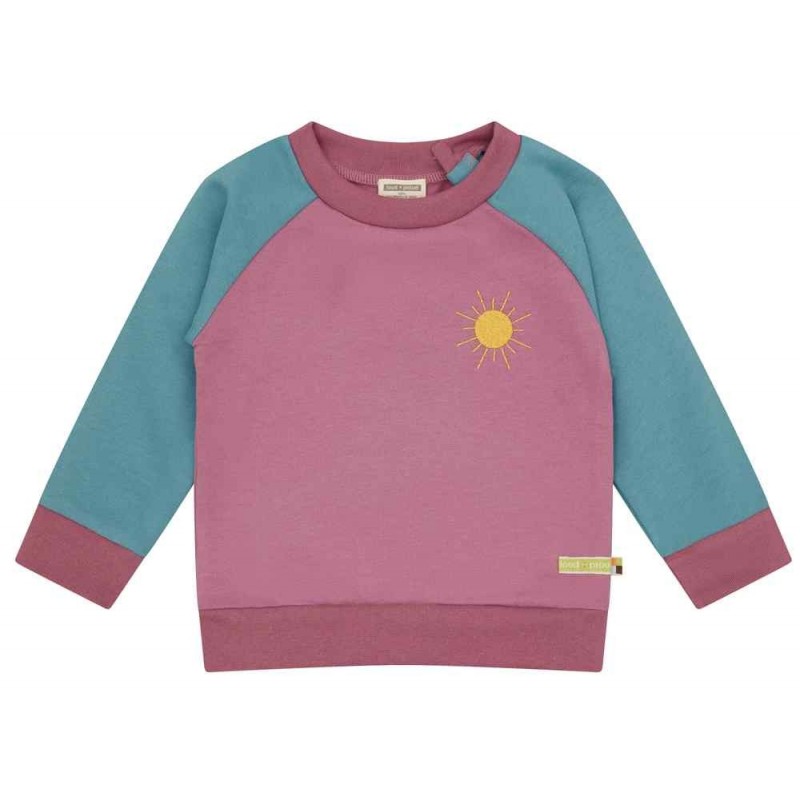Weiches Sweatshirt mit Raglanärmeln in zwei verschiedenen Farben von loud+proud und Sonnenstickerei auf der Brust. Mit Holzknöpfen am hinteren Halsauschnitt bis (inkl.) Größe 86/92, danach ohne extra Verschluss.