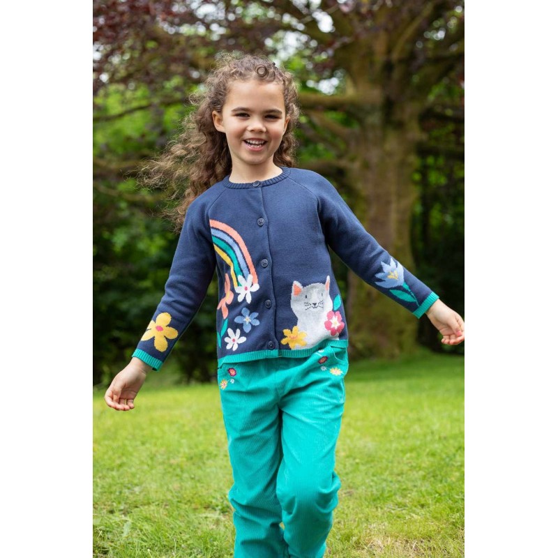 Süße Kinder Cordhose mit Blumen-Stickerei, zwei seitliche Eingrifftaschen und hinten zwei aufgesetzte Taschen. Mit weichem Gummibund.