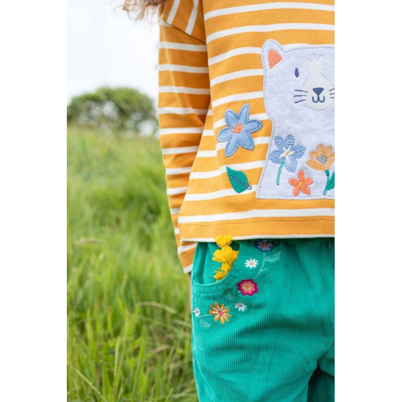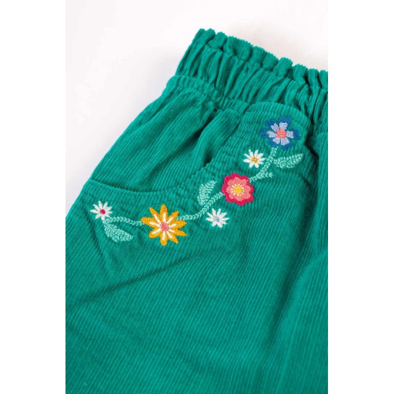 Süße Kinder Cordhose mit Blumen-Stickerei, zwei seitliche Eingrifftaschen und hinten zwei aufgesetzte Taschen.