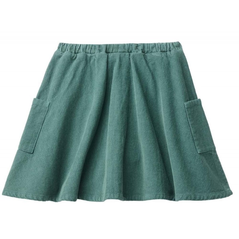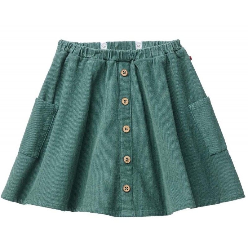 Cooler weit schwingender Rock aus Cord mit angedeuteter Knopfleiste mit Kokosknöpfen, verstellbarem Gummibund (mit Knöpfen innen) und aufgesetzten Seitentaschen von People Wear Organic.