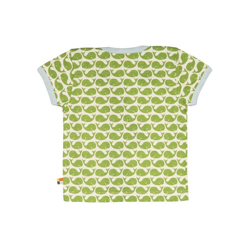 Das Shirt ist mit einem lustigen Wal-Allover verziert und die Kanten sind mit einem kontrastfarbigen Einfassband abgesetzt.