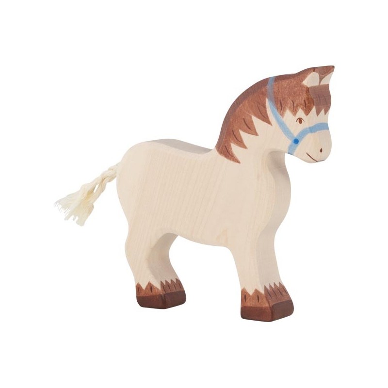 Süßes Zugpferd aus massivem Ahornholz. Handbemalt mit kinderfreundlichen Farben auf Wasserbasis.