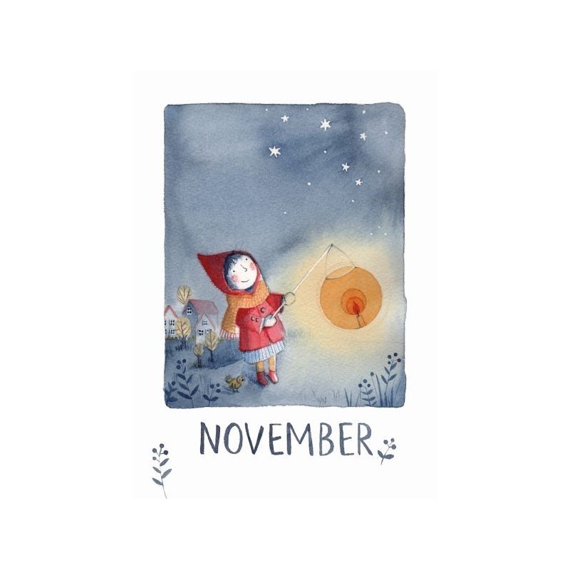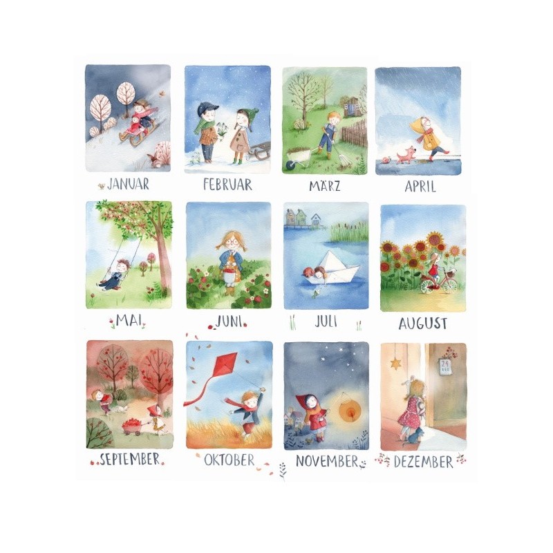 Liebevoll gestaltete Karten für jeden Monat im Jahr. Im Set sind 12 Karten enthalten.